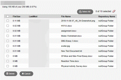 • To delete a file or files, select the appropriate checkbox(es) and click Delete. A message asks you to confirm the deletion. Click Yes to confirm. The files are deleted, and your space quota is updated accordingly.