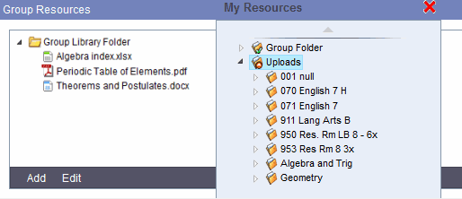 • Within My Resources, you will see a folder for each group that you are the page administrator for. For example, you might have English Literature, English Language Arts, and Drama Club folders. Notice that these folders have the checkmark icon . If you upload files to the English Literature folder, this content will automatically appear in the Group Resources widget for all members of that group. Any resource added to the Group Resources widget also appears in members' My Resources group folder, but with a read-only status .