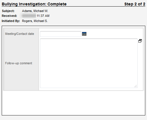 date you met with or contacted the students' parents. - In the Follow-up comment field, type any feedback or concerns given by the parents about the investigation.