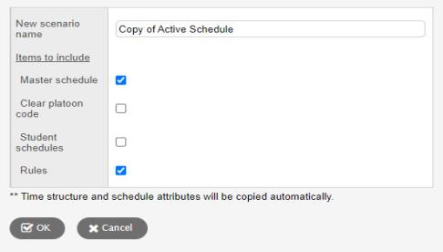 - Select the checkboxes of the items you want to copy from the original scenario to the new scenario. For example, you might want to copy the schedule you built with the original scenario, but not the rules because you want to try to build a schedule with fewer restrictions.
