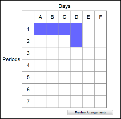 - After you define all components, click Preview Arrangements below the Days/Periods grid. The grid continually displays all of the options Aspen will consider for courses with these components. Click Stop Preview to stop the preview.