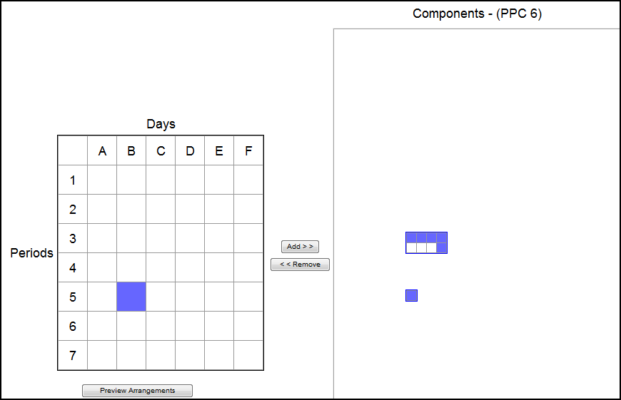 For example, a school might create a pattern in which a course must meet a total of six times during a cycle in the Days/Periods grid. Then, Add is clicked to move the pattern to the Components grid. When Preview Arrangements is clicked, the Days/Periods grid continually displays a sampling of pattern configurations that Aspen will consider for courses with these components.