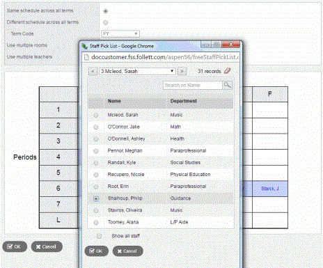 1. Find and select the teacher, and click OK. That teacher now appears as assigned to that section on the day/period you clicked.