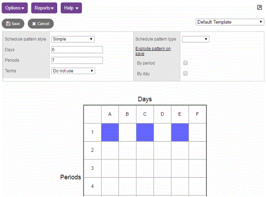 1. You can explode Simple and Compound pattern types. Below Explode pattern on save, select the By period and By day checkboxes if you want the system to create every possible pattern based on the pattern you create in the grid after you click Save. Exploding patterns minimizes the number of patterns you actually define. Most schools need to define only a few patterns, and the system creates all versions of that pattern for them.