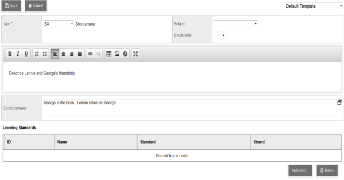 2. Note: For district- and school-level questions, select the Subject and Grade level. This determines which teachers can select these questions when creating online quizzes.
