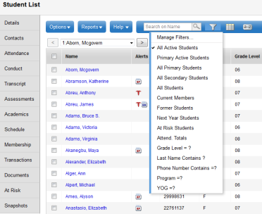 of students and then want to return to viewing only active students.